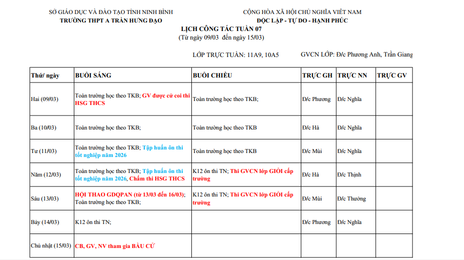 TUẦN 7 HK2 – TỪ NGÀY 09/03/2026 ĐẾN NGÀY 15/03/2026